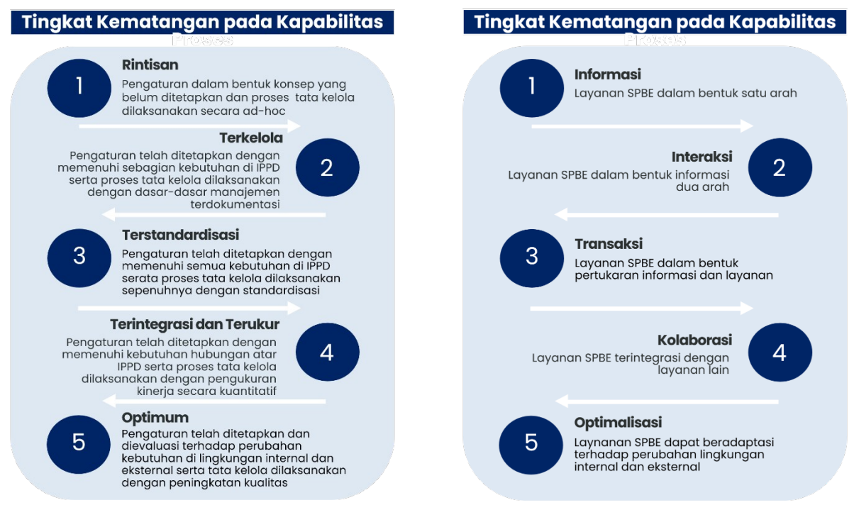 Pada Domain 1,2 dan domain 3 diukur tingkat kematangan Kapabiltas Proses, sedang Domain (4) Layanan diukur tingkat kematangan kapabilitas Fungsi. Berikut tingkatan (level) kematangan pada setiap indikator evaluasi SPBE yang berjumlah 47 indikator.